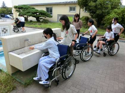 今回は、車いす体験です。車いすに乗ること、車いすを押すことのどちらも体験しました。「少しの段差でも怖く感じた」「車いすを押すときは声をかけると少しは安心する」など、体験したからこそ学べたことがたくさんあったようです。また、車いすで生活をしている方の講話から、「床に落ちたものを拾ってくれると助かるというのは、車いすの人だけじゃなくて、自分たちにもうれしいことだ」という気づきもありました。