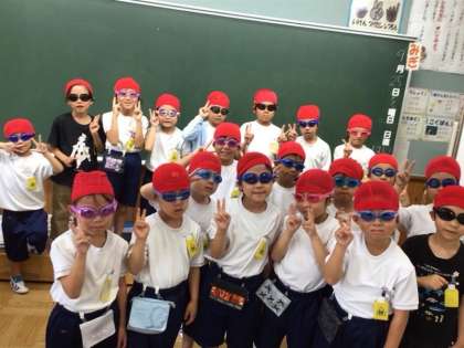 3組は、水泳学習に向けて、水泳帽子とゴーグルを付ける練習をしました。毎日時間を見つけて取り組んでいるので、髪の毛をしっかり入れて素早くできるようになりました。みんなでそろって、はいポーズ!