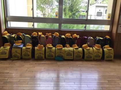 5時間目にお話の絵の色塗りをしました。その前に帰りの支度をしました。ランドセルをワークスペースに置くようにだけ伝えたら、こんなにもかわいく並べていました。思わず写真に撮ってしまいました。