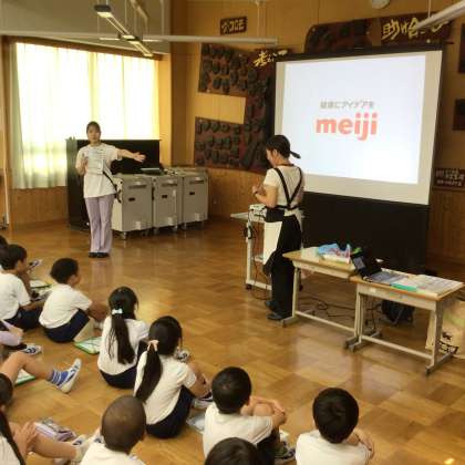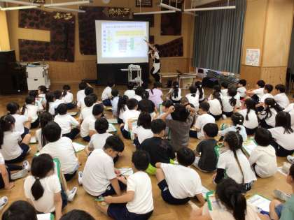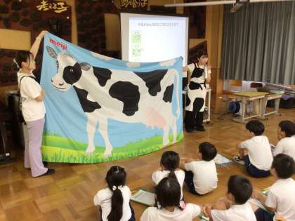 社会科の工業の学習の一環として、明治牛乳の職員さんを講師に招き、牛乳作りのひみつを教えていただきました。牛乳がどのような工程を経て製品となり自分たちのもとへと届くのか、安全面や衛生面への配慮はどのようにしているのかなど、今まで疑問に感じていた牛乳作りのヒミツを詳しく知ることができました。また、健康な成長のために進んで牛乳を飲もうとする意欲も大いに高まったと思います。