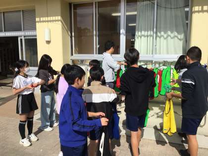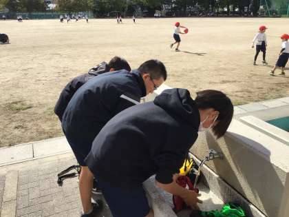 運動会で使用したビブスとゴールテープを、サンサンタイムやゴーゴータイムを使って洗濯しました。家庭科の学習を生かして、手洗いで汚れを落とし乾燥まで自分たちの手で行いました。見た目では気づかない汚れにも、手洗いすることで気づくことができました。綺麗になって乾いた後のビブスを気持ちよさそうに畳んで、充実した笑顔を見せてくれました。