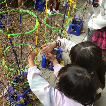 アサガオの葉や花の数が少なくなり、つるが目立つようになってきました。そこで、アサガオリースを作り始めました。友達に手伝ってもらいながら、支柱からつるを外したり、円く形を整えたりしました。