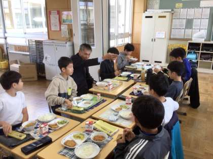 修学旅行に向けて、校長先生が6年生の各クラスで給食を食べに来てくださっています。楽しみにしていることなどお話をして修学旅行への気持ちも高まってきました。2組には、当日来校していた特別ゲスト様も参加してくださり、温かな雰囲気で会食をしています。