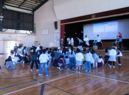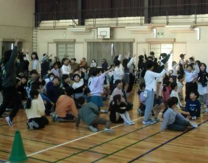 第2部では、参加者全員が体育館に集まり、クイズ大会やお菓子まきで大いに盛り上がりました。マリオも登場し、子どもたちは大喜びでした。お菓子まきは、量を増やしていただいたり、まく場所を平等にしたりしていただいたおかげで、どの子も満足していたようです。
