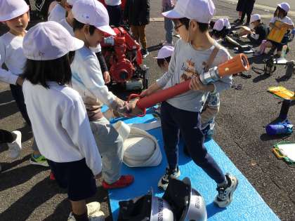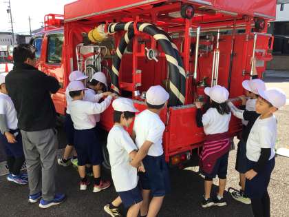 平芝区民会館コースは、まず消防団の車庫を見せていただきました。消防車を見るだけでなく、ヘルメットを被ったり、放水に使う道具を触らせていただいたりして、大喜びでした。また、ホースの洗い方、ほし方を知り、驚いていました。後半は、区民会館の中で、防災についてたくさんの質問に答えていただきました。2回目の探検で、初めて知ることが多く、たいへんよい学習になりました。