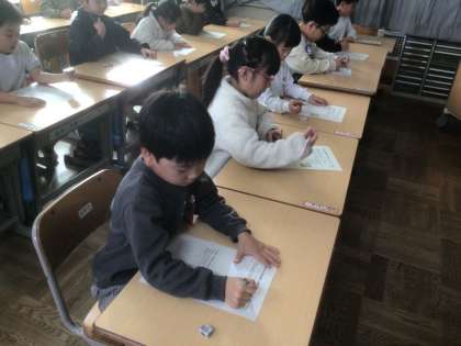 その後、絵本「きつねのおきゃくさま」の読み聞かせを行い、自分を頼りにしてくれるひよこ・あひる・うさぎに対するきつねの気持ちがどう変わっていったのか、周りの期待にこたえて「がんばったこと」や「相手にしてあげたこと」について考えました。低学年からは「きつねがだんだんやさしくなってよかった」、「ひよこやあひる、うさぎのために、おおかみと戦うなんてすごい」という感想が、高学年からは「学年があがるにつれて、友達や学校のことを考えるようになった」、「高学年として挙母小を引っ張っていこうと思う」といった思いが聞かれました。