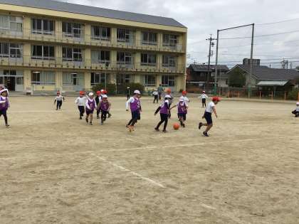 12月3日にグランパスボールクリニックがありました。ボールが遠くへ行ってしまわないように、蹴る強さに気をつけながらドリブルの練習をしました。最後のミニゲームでは、元気いっぱいにボールを追いかける子、自陣のゴールを守ろうと待ち構える子、仲間に広がるように声を掛ける子など、様々な姿が見られました。シュートが決まったときには、歓声が上がっていました。