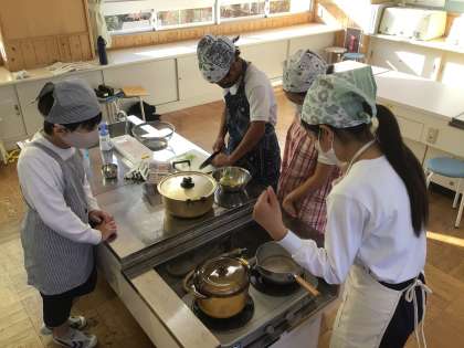 今回は「食べて元気!ごはんとみそ汁」の学習で、ごはんとみそ汁を作りました。お米は鍋を使って炊き、炊ける様子を観察しながら調理しました。みそ汁はにぼしからだしを取り、だいこん、ねぎ、油揚げを入れました。だしを取る経験は初めての子が多くいましたが、調理したみそ汁を飲み、だしの大切さに気付くことができました。以前の調理実習の時より、包丁を上手に使える子が増えたように思います。ごはんとみそ汁の栄養についても学習しています。普段の食事の栄養バランスについてもぜひご家庭でも話題にし、みそ汁作りに挑戦できるといいですね。