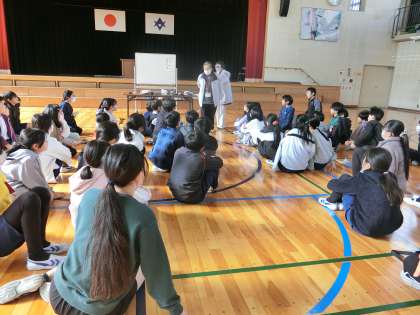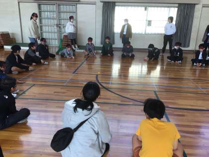 人が持っている視覚、聴覚、嗅覚、味覚、触覚の大切さや、視覚障がいの方の実際の生活の様子と視覚がないからこそ、ちょっとした音などにも気づくことができることなどの講話をしていただきました。また、実際にアイマスクを付けて目が見えない状態で折り紙を折ってみると、表裏がわかりにくかったり、端をそろえて折ることが難しかったりしました。音が鳴るボールを転がすゲームをすると、見えないとわかりにくいけど、音でなんとなくわかるという感覚もあったようです。