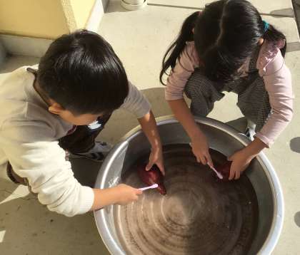 先日、生活科で育てたサツマイモを収穫しました。その後、土を落として洗い、いよいよ食べる日になりました。