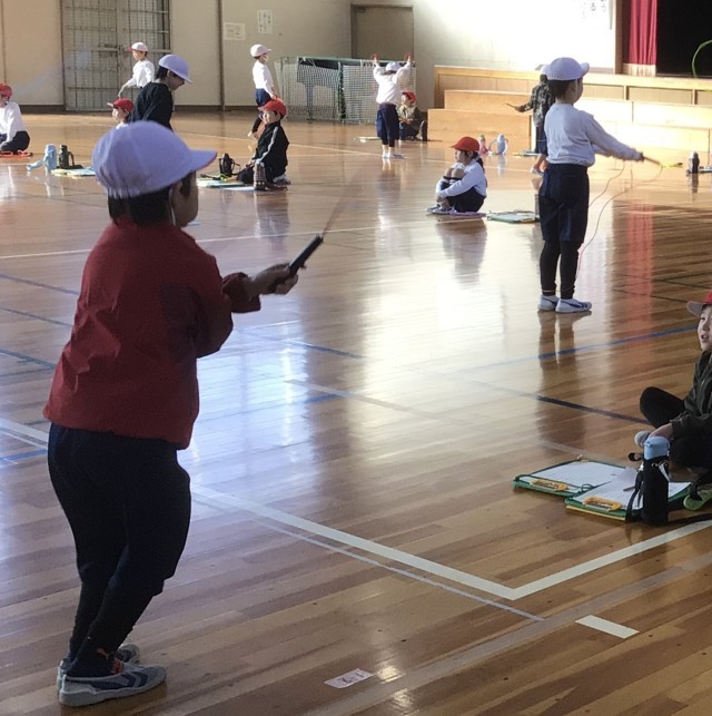 後ろ交差跳びや後ろあや跳びは難しいようで、どうしても後ろ跳びから手を交差できずに縄が引っかかる子どもが多かったです。前の交差跳びは跳べる子どもが多く、何回跳べるか白熱していました。その後の休み時間には、練習する姿が見られ、やる気が伝わりました。