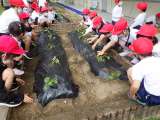 教室の前にある花壇に、サツマイモの苗を植えました。 校内整備員の澤田さんが畝を作...