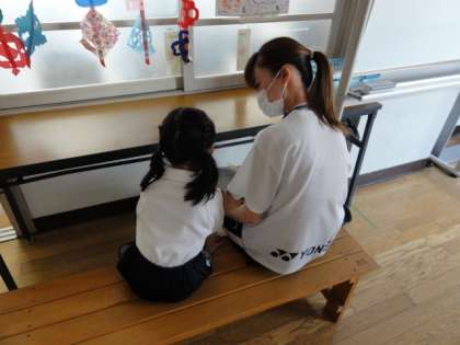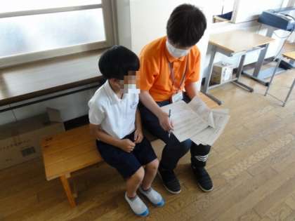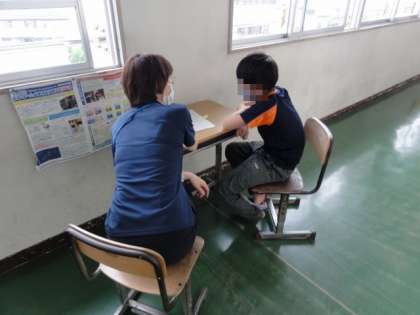 朝の衣丘タイムの時間に、担任が子どもたちと一対一で面談します。勉強のこと、友達のこと・・・、子どもたちがちょっと気になっていることなどを、担任に話すことで、解決の糸口をアドバイスしています。