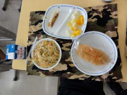 本日の給食は、子どもたちの大好きな「いためビーフン」「米粉パン」「ぎょうざ」「なしポンチ」「牛乳」でした。
