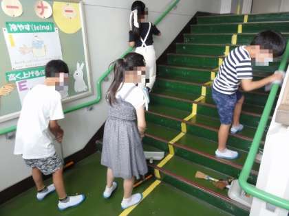 清掃時も、無言です。みんながさわる手すりなど、きれいに拭いています。