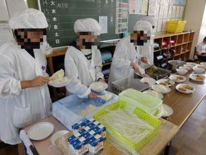 【上の写真】感染防止に気を付けて、給食当番が配膳。