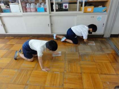 【下の写真】保健室の掃除、丁寧に床を拭いています。