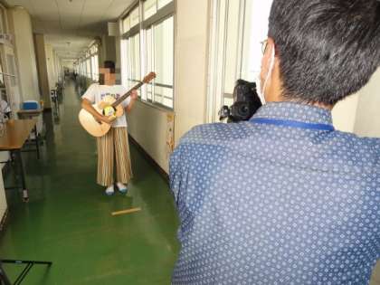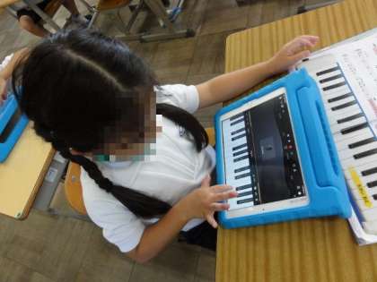 【上の写真】鍵盤ハーモニカの使用は控え、タブレットで演奏しています。