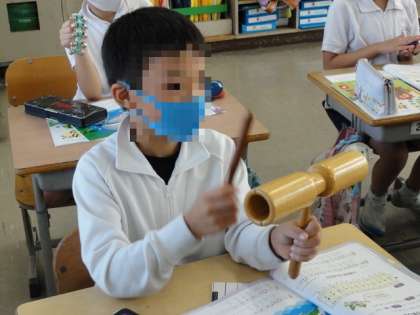 【中の写真】音楽の授業は、感染リスクの少ない打楽器等の学習を選んで進めています。