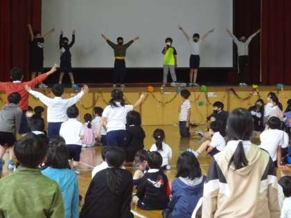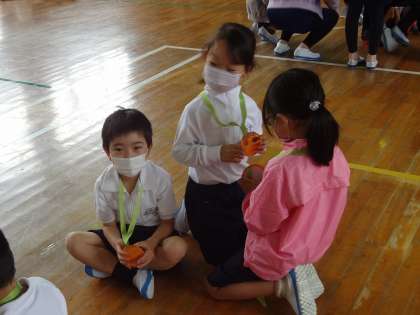 6年生が司会・進行し、1年生が参加しました。また、2・3年生は校歌披露のビデオ、4年生はみかんの顔の掲示作り、5年生はメダル作りで1年生の入学をお祝いしました。会では、〇×クイズや全身ジャンケン大会、校歌のビデオ視聴やプレゼント渡しなどを行いました。笑顔いっぱいの楽しい時間になりました。