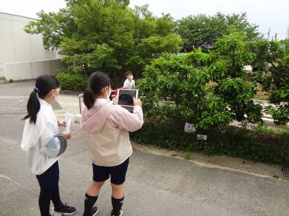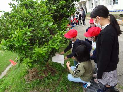 1年生と6年生が参加し、担当するみかんの木に班名の書いてあるプレートを取り付けました。まず、6年生がみかんの木まで案内し、協力してプレートを取り付けました。その後、6年生が学習用タブレットで記録写真を撮りました。