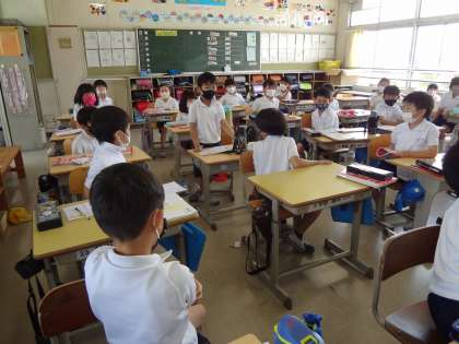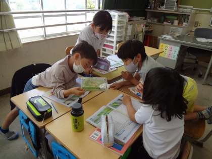 1年生は司会の子が朝の会を進めています。2年生は国語で、発言している子をみんな注目しています。3年生は理科でさなぎの様子をグループで観察しています。