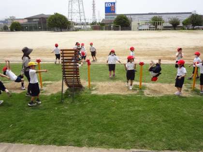 1年生は体育で鉄棒の練習です。2年生は生活科で観察記録をつけています。3年生は国語で習字に取り組んでいます。