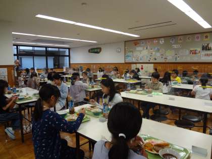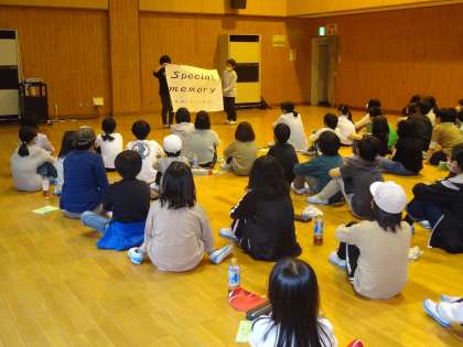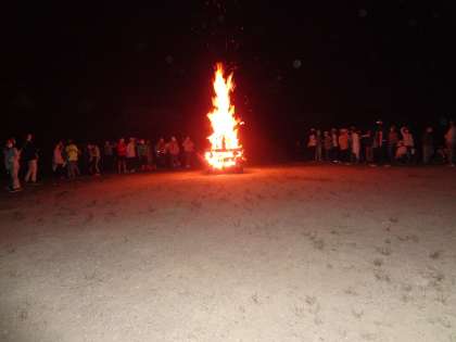 どんぐり食堂でのおいしい夕食です。夕べのつどいでスローガンの確認をしています。キャンプファイヤー、炎を囲んで楽しい時間を過ごしました。
