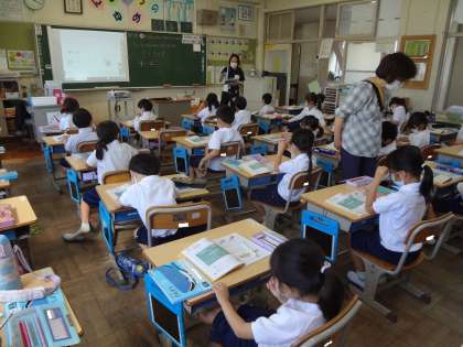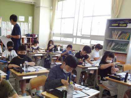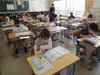 1年生は算数、サポートティーチャーの先生にも見てもらっています。2年生は姿勢に気を付けて書写を行っています。3年生は習字に取り組んでいます。