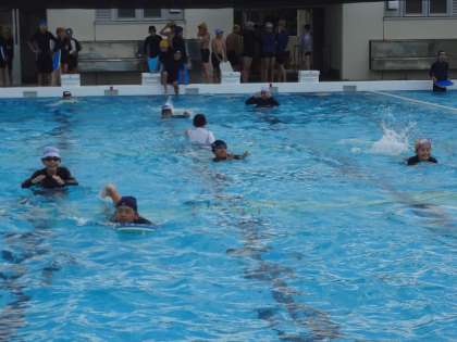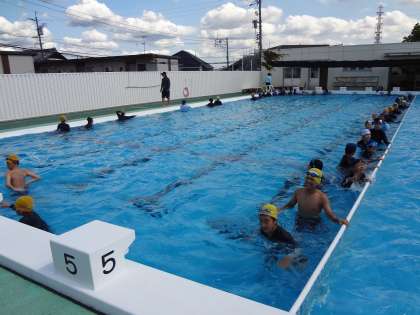 プールに入る前に先生の話を聞いています。プールの端を1列で、まずは水中歩行。ビート板なども使いながら、25メートルを泳ぎます。