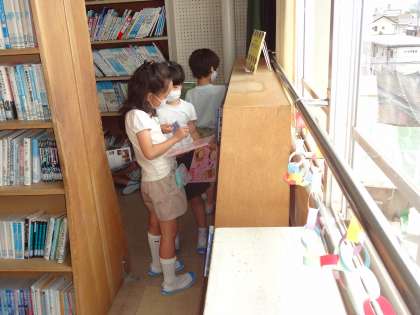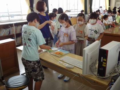 図書館まつりが始まり、図書館に多くの子が来ました。どの本を借りるか選んでいます。借りる本が決まったら、カウンターで図書委員さんが手続きをしてくれます。