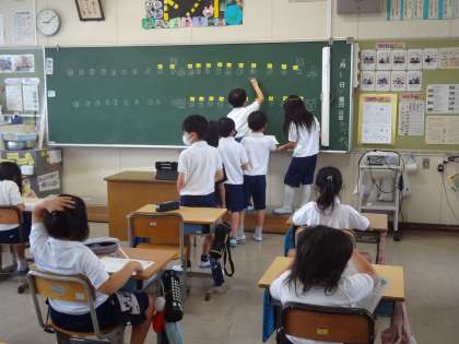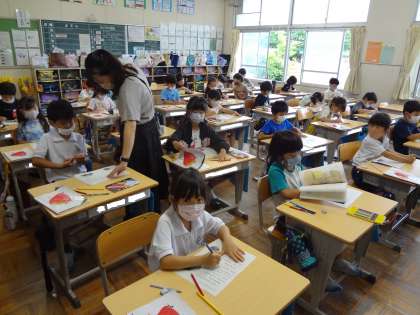 1年生は国語の学習で、色分けをしながら文の内容を読み取っています。2年生は国語の学習で、漢字を黒板に書いています。3年生は外国語活動で、色の言い方を習っています。