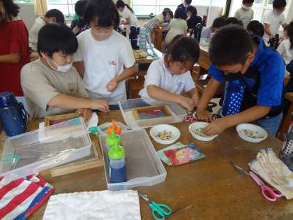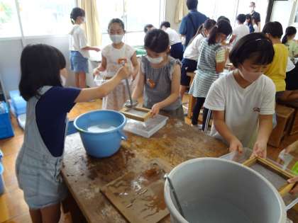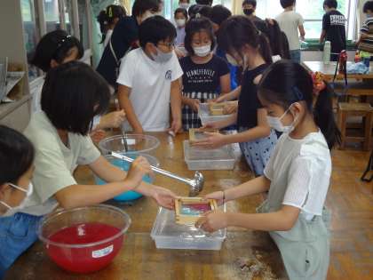 洗った木の枠にコウゾを入れてもらいます。次に、水色、ピンク、黄色パルプを入れてもらいます。自分の好きな1色または2色を選べます。自分の席で飾りやもよう、名前を入れ、最後にもう一度コウゾを入れます。現在、和紙を乾燥させています。