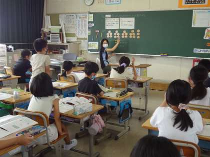 2年生は空気でっぽうで積んだ紙コップをくずす遊びをしています。3年生は算数であまりのある割り算の学習をしています。