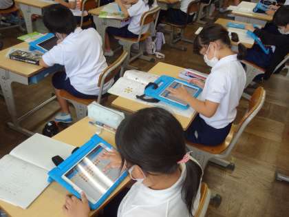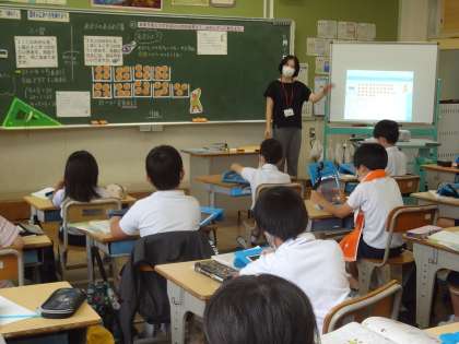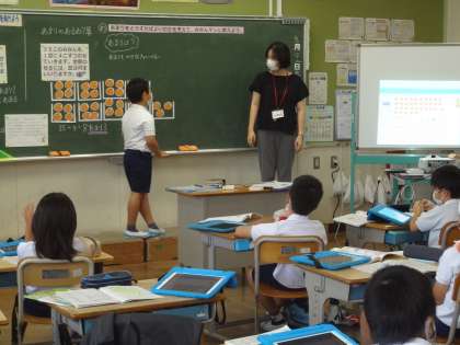 3年生で算数の授業研究会を行いました。タブレットを使って一人一人考えています。ミカンの絵を黒板に貼って図を作り、必要なお皿の枚数を考えます。課題を確認し、みんなで話し合いながら学びを進めていきます。
