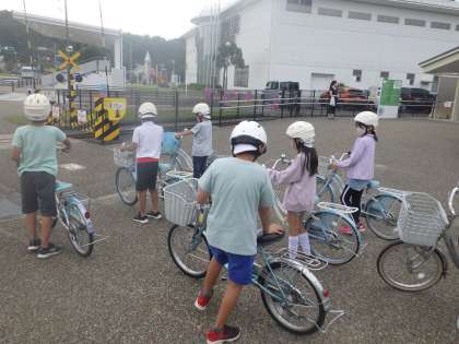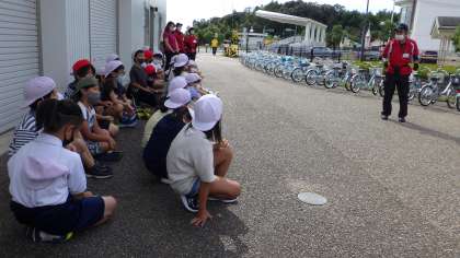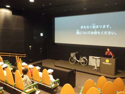 シアターで、学習項目についてクイズ形式で学びました。また、点検やヘルメットの重要性など自転車の安全な乗り方を学びました。
