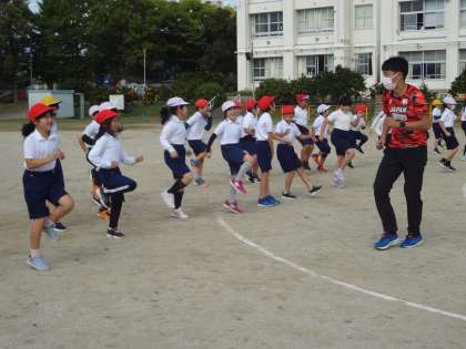講師は、現役アスリート、2020東京オリンピック4×400m代表の 川端魁人選手です。腕の振り方や腿のあげ方など、速く走るために大切なことを教えていただきました。