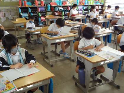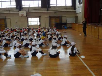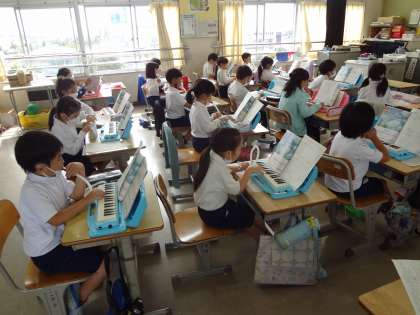 体育館で、運動会にむけての話を聞いています。算数の問題に取り組んでいます。音楽で鍵盤ハーモニカの練習をしています。