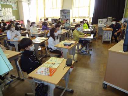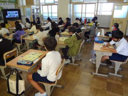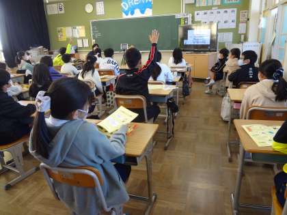 社会の工業の学習で、トヨタ自動車のオンライン学習を行いました。つながっている画面を見ながら、質問に答えたり、説明を聞いてワークシートにキーワードを書き込んだりして学習しました。