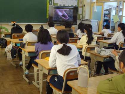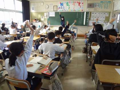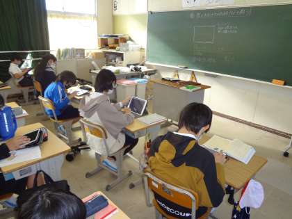 タブレットを使って、話の面白さが伝わるPOPを作成しています。国語の学習で挙手をして意見を発表しようとしています。理科で川原の石の様子について動画の説明を見ています。
