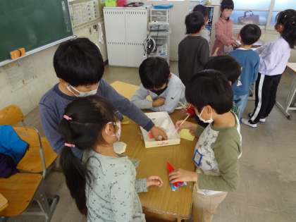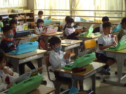 音楽の授業で、鍵盤ハーモニカを吹く子と、手拍子を曲に合わせてする子に分かれて演奏しています。生活科で、2年生が作ったおもちゃで1年生が遊ぶという交流学習をしています。