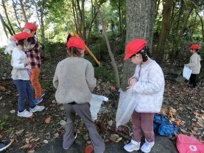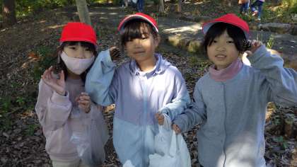 毘森公園へ、秋を見つける校外学習に出かけました。地域学校共働本部のボランティアのみなさんにも見守っていただきました。どんぐりや松ぼっくりなどを見つけ、活動に使用できそうなものを拾いました。