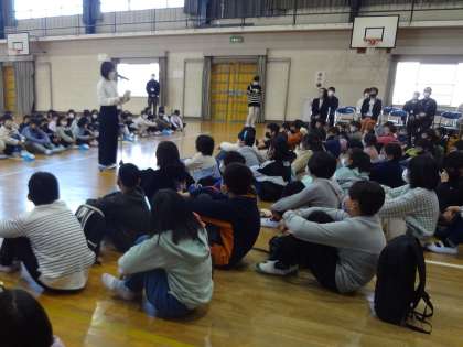 各クラスの代表児童が参加してお迎え式をおこないました。代表児童が歓迎のスピーチをしました。みかんの収穫の仕方のビデオを見てもらいました。ミカンマンに扮した児童の楽しい寸劇を見てもらいました。