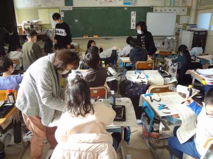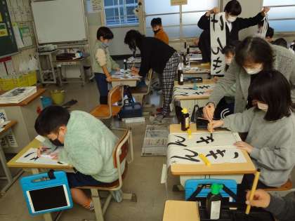 書道の先生をお迎えして、書初めの練習をしました。3年生は初めての毛筆での書初めとなります。