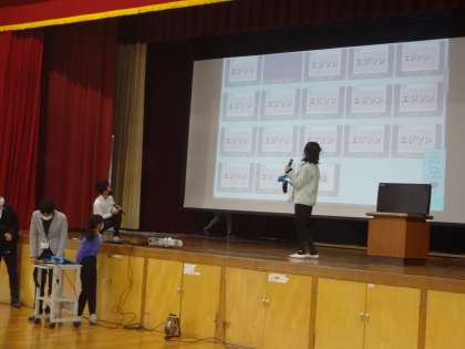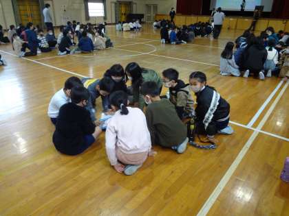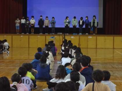 4年生の司会進行で行いました。グループでクイズの答えを考えます。グループで考えた答えは、前のスクリーンに映し出されます。