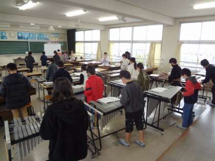 算数の授業、タブレットで復習問題に取り組んでいます。音楽の授業、みんなで合奏しています。