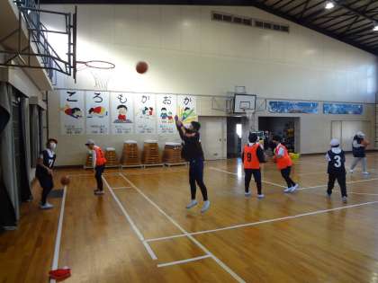 図工の授業、作品にニスを塗っています。体育の授業、バスケットボールのチーム練習をしています。算数の授業、切り抜いた図形を近くの席の友達と見せ合って考えています。