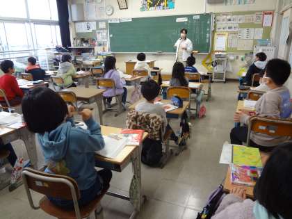国語で、物語の学習をしています。体育の授業、なわとびの練習をしています。