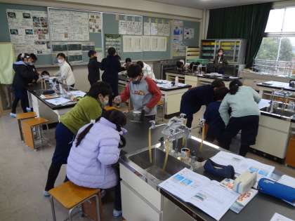 学級活動でお世話になった方へのお礼の手紙を書いています。理科の授業、理科室で班ごとに、空気のあたたまり方の実験を行っています。
