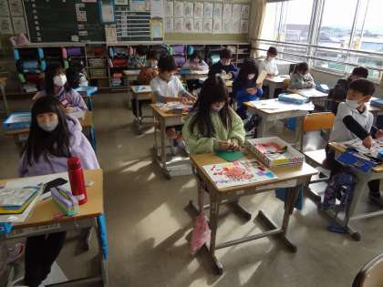 図工の授業、細かくちぎった紙をはって作品を作っています。算数の授業、本日の課題に取り組んでいます。
